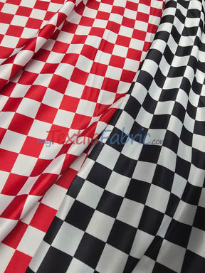 - Checkered Racing Satin Print Fabric. Checkers are 1" x 1" in size. Two colors available.
