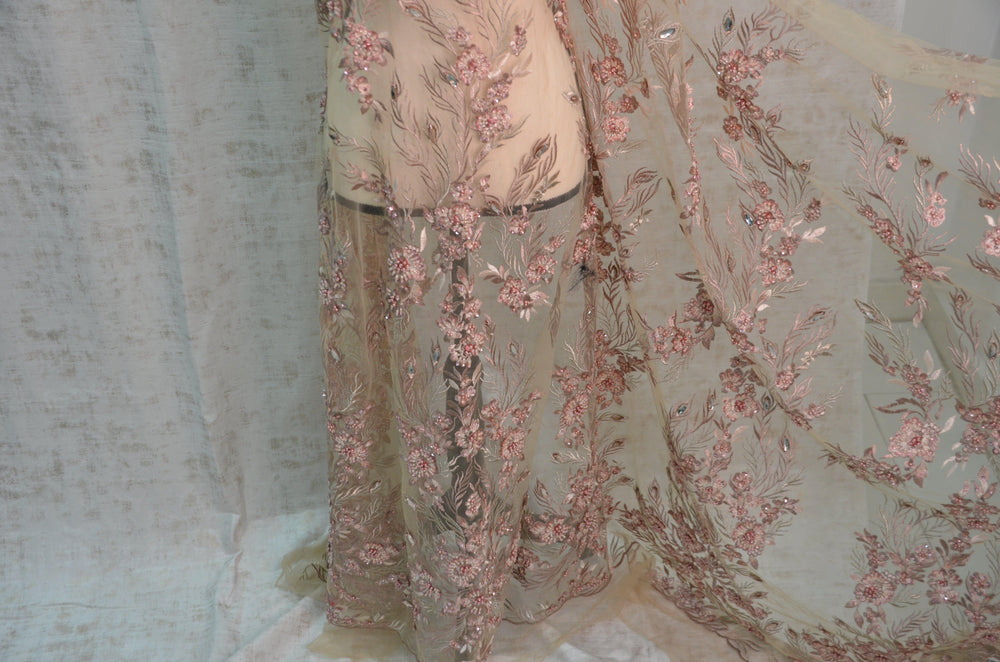Dusty Rose Diamond Beaded Bridal Lace Fabric | Dusty Rose Embroidery Lace Fabric | 50" Wide | Wedding Beaded Lace Fabric |