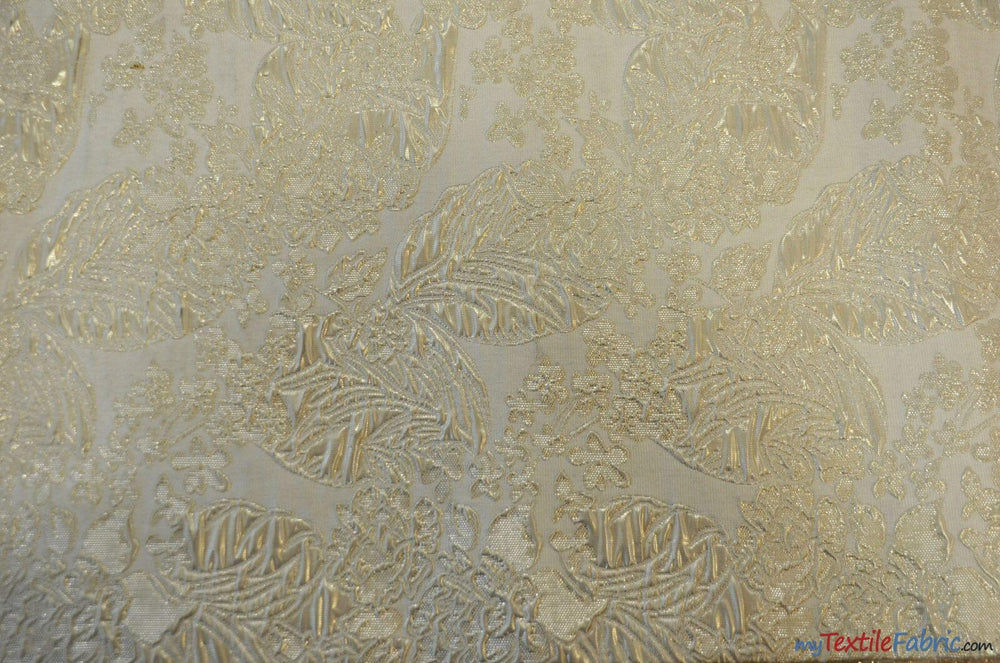 Botanical Bubble Metallic Jacquard Design # 16975A is a 54" wide 100% Polyester Metallic fabric. This Jacquard has metallic veins running criss cross through the fabric. Great for Costumes and Design. For backdrops and Curtains as the weight and hand flow is just right. Event rental customers can use this fabric for overlays, tablecloths, and chair covers.