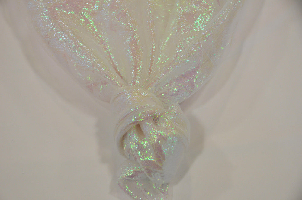 Crushed Iridescent Pearl Organza is an Iridescent sheer plain Crushed organza. Great for the children's clothing and fantasia style brands. Fabric has a natural iridescent look to it. The White color is the most popular with its vivid rainbow style sparkle.