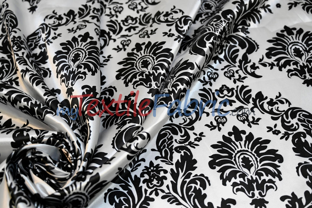 White Black Damask Satin Print Fabric  Two colors available. White and Black - Black and White.  Fabric is printed on a Semi Dull Heavy Satin.  Prints are printed in Korea.  Makes for a great tablecloths, overlay and sash for the event industry.  Great for Apparel patterns and designs.